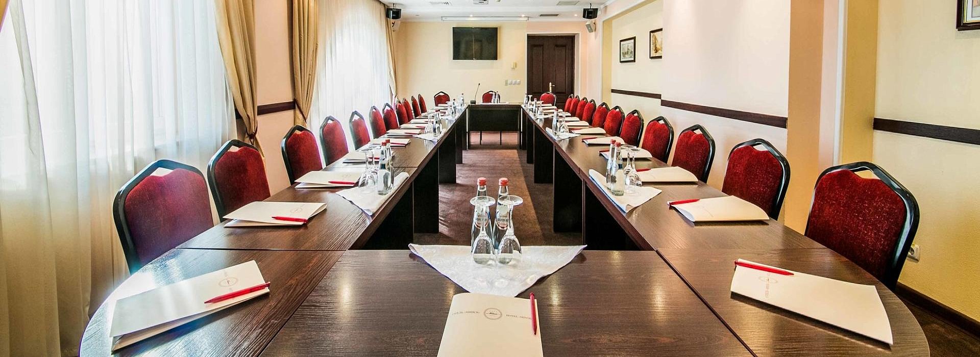 The conference hall is located in the main building of the Hotel on the 2nd floor and has a capacity of 30 seats. The hall can also be equipped with all necessary equipment.